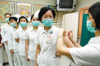 臺(tái)灣臨床醫(yī)護(hù)人員2日上午開(kāi)始全面注射甲型流感疫苗,以防止疫情擴(kuò)大。來(lái)源:臺(tái)灣《聯(lián)合報(bào)》