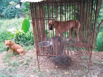高雄縣旗山鎮(zhèn)一處私人犬只繁殖場(chǎng)內(nèi),兩只原本應(yīng)該雄糾糾的斗犬,餓到皮包骨,看到人靠近還會(huì)發(fā)生害怕的低鳴。來(lái)源:臺(tái)灣《聯(lián)合報(bào)》
