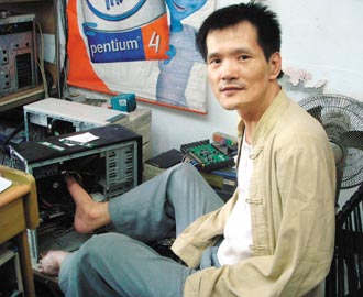 失去雙手的林俊宏是電腦維修店老板,他用腳修電腦,用腳打字速度不輸正常人。來源:臺灣《聯(lián)合報》