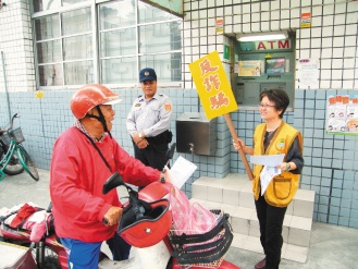 全臺(tái)灣警力昨天都投入防詐騙倡導(dǎo),配合志工守護(hù)在提款機(jī)附近。來(lái)源:臺(tái)灣《聯(lián)合報(bào)》
