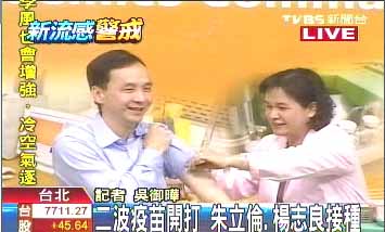 據(jù)臺灣TVBS電視臺報(bào)道,臺灣自制的甲型H1N1流感疫苗,今天開始第二輪施打,防疫總指揮朱立倫和“衛(wèi)生署長”楊志良今天來到臺當(dāng)局“疾管局”接種疫苗。一個步驟一個步驟來,量測體溫、拿出健?,由一旁的護(hù)理人員來施打。楊志良還問了朱立倫,打這疫苗會不會痛?朱立倫說一點(diǎn)也不痛,希望臺灣人對自制疫苗有信心。