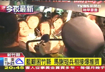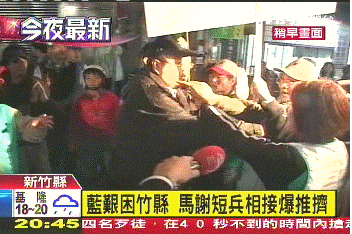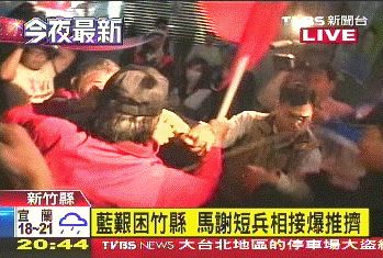 據(jù)臺灣TVBS電視臺報道,馬英九、謝長廷,各自帶著候選人掃街,沒想到半路上,狹路相逢,爆發(fā)沖突。綠營支持者不滿員警為了元首維安,在馬路上拿盾牌筑人墻,不讓拜票隊伍經(jīng)過,情緒爆發(fā)。他們對著馬英九高喊:“為什么不能過去?為什么不能過?”混亂中還有人動手拉扯候選人旗幟,場面更加混亂。