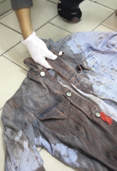 李忠財狠心殺害前妻周錦惠,當時她穿的牛仔衣一片血跡,上衣左胸可清楚看見被刺一個大洞。(圖片來源:臺灣《聯(lián)合報》)