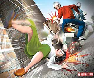 樓容妤斜背包包遭歹徒飛車行搶,硬扯包包害她重摔,頭部受創(chuàng)成植物人。來源:臺(tái)灣《蘋果日?qǐng)?bào)》