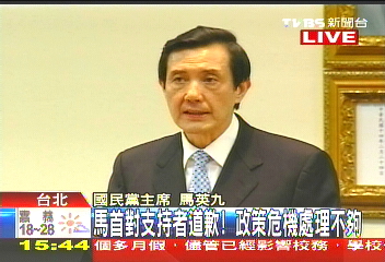國(guó)民黨中常會(huì)檢討“三合一”選舉,黨主席馬英九兩度致歉。來(lái)源:臺(tái)灣TVBS電視臺(tái)