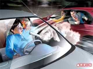 飆車族駕車逆向沖過來,朝正在等紅燈的鄭姓駕駛車內(nèi)丟信號彈,瞬間車內(nèi)就布滿煙霧。 來源:臺灣《蘋果日報(bào)》