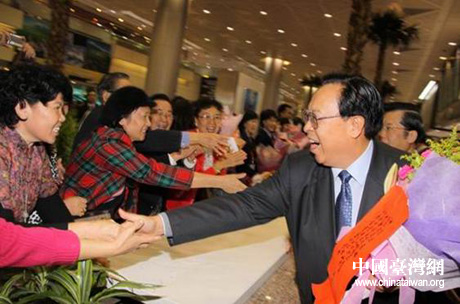 “中原文化寶島行”代表團(tuán)抵達(dá)臺北桃園機(jī)場,島內(nèi)民眾自發(fā)到機(jī)場迎接,圖為徐光春向前來歡迎的民眾揮手致意。圖片來源:河南省臺辦