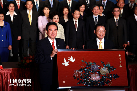 中國臺灣網(wǎng)12月22日臺中消息 22日下午,海協(xié)會會長陳云林向臺灣海基會董事長江丙坤贈送揚州漆器《和平發(fā)展》。當(dāng)天下午,兩岸兩會領(lǐng)導(dǎo)人在臺中市簽署了《海峽兩岸漁船船員勞務(wù)合作協(xié)議》等三項協(xié)議。(中國臺灣網(wǎng) 李徽 攝)