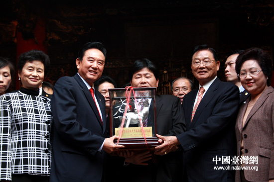 臺(tái)灣大甲鎮(zhèn)瀾宮院長(zhǎng)顏清標(biāo)向陳云林贈(zèng)送錫雕《福祿壽喜》。 (中國(guó)臺(tái)灣網(wǎng) 李徽 攝)