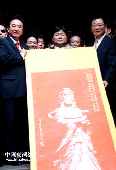 陳云林回贈(zèng)顏清標(biāo)一幅媽祖畫(huà)像。 (中國(guó)臺(tái)灣網(wǎng) 李徽 攝)