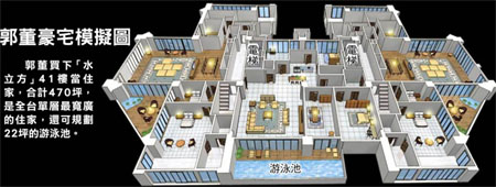 開發(fā)商原規(guī)劃41樓為超豪宅產(chǎn)品,單層單戶470坪,開價3億元,郭臺銘一口氣要買3個樓層,從39樓到41樓全包下,總坪數(shù)1410坪。41樓將與狗狗、寶貝小女兒妞妞共筑溫暖的家,40樓與39樓將規(guī)劃為鴻海集團(tuán)招待所。