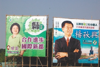 中國臺灣網(wǎng)1月18日消息 據(jù)臺灣《聯(lián)合報》報道,年底大高雄市長選舉,民進(jìn)黨上演“秋(高雄縣長楊秋興)菊(高雄市長陳菊)之爭”。兩人比鄰豎立廣告牌,“合作進(jìn)步,國際新都”與“五顆星南方小巨人”互別苗頭。(高大林)