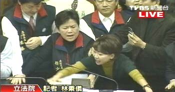 因為民進黨反對國民黨版本的臺灣地方制度規(guī)定,因此有民進黨籍“立委”伺機沖上主席臺,企圖阻撓臺灣“立法院長”王金平進行表決程序,而國民黨籍“立委”也不甘示弱上前圍堵,雙方便在主席臺上僵持不下。(陳佳慧)