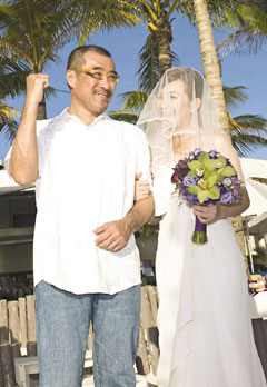 婚禮籌備近4個月,耗資數(shù)百萬,新郎趙元同終于秀出秘密武器,安排一艘風(fēng)帆船開至沙灘邊,上面裝飾著斗大的英文名字“FISH&TONY”,以這艘“愛之船”象征展開新婚生活。
