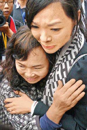 曾馨瑩(右)7日參加永齡基金會(huì)舉辦的慈善嘉年華,一名曾受幫助的馬來西亞截肢青年母親,特別伸手熱情擁抱她,無盡的感謝盡在不言中。圖片來源:臺(tái)灣《中國時(shí)報(bào)》