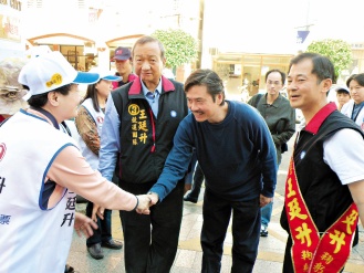 國(guó)民黨秘書長(zhǎng)金溥聰(右二)上午陪為國(guó)民黨籍花蓮“立委”候選人王廷升(右一)助選,稱蕭美琴欠臺(tái)灣人民一個(gè)道歉。 來源:臺(tái)灣《聯(lián)合晚報(bào)》