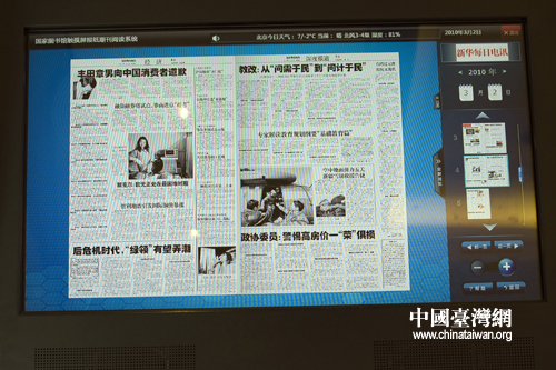 國家圖書館為代表委員提供的電子報紙閱讀機安放在駐地賓館的走廊里,極大的方便了代表委員及時了解各方面的信息。(中國臺灣網(wǎng) 肖春陽 劉洋 攝)