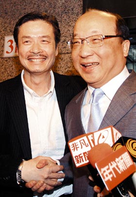 臺中市長胡志強(右)昨天前往國民黨中央黨部拜訪秘書長金溥聰(左),表達參選大臺中市長是他最愛的選擇,也是唯一的志愿。來源:臺灣《聯(lián)合報》