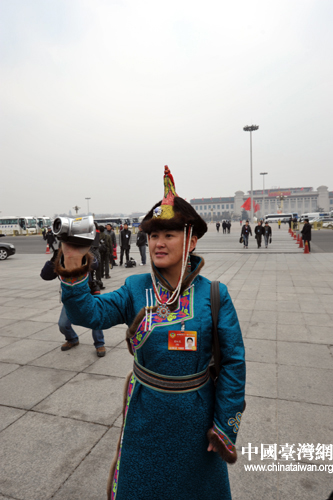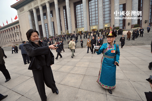 中國臺灣網(wǎng)3月8日北京消息 全國政協(xié)委員、青海省烏蘭縣蒙醫(yī)院副院長菊紅花這次參加全國兩會自己帶著攝像機一路拍攝,和倪萍委員相遇后,倪萍委員也拿出數(shù)碼相機拍攝菊紅花,兩人的相互拍攝形成兩會一道風(fēng)景線。(記者 肖春陽、劉洋)