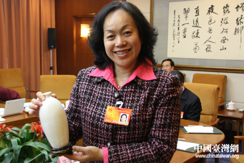 圖為臺籍女代表陳云英對節(jié)日禮物愛不釋手 (中國臺灣網(wǎng) 徐維彬 攝)