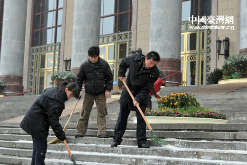 工作人員忙著清掃積雪!。ㄖ袊(guó)臺(tái)灣網(wǎng)發(fā) 肖春陽(yáng)、劉洋攝)
