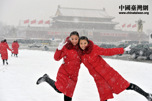 禮儀小姐興奮的映雪起舞!。ㄖ袊(guó)臺(tái)灣網(wǎng)發(fā) 肖春陽(yáng)、劉洋攝)
