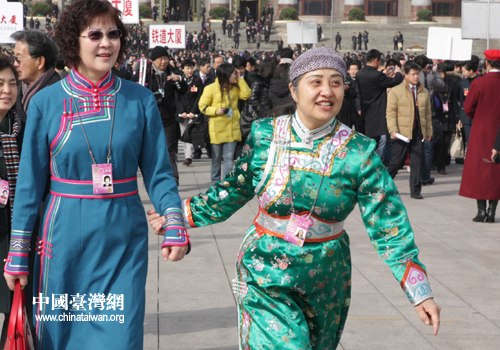 政協(xié)委員們今天盛裝出席閉幕會,少數(shù)民族委員穿上了民族服裝吸引鏡頭,宋祖英等解放軍界別委員一身戎裝分外精神,姜昆系上了紅領(lǐng)帶,女委員們也不約而同的身著紅衣,與天安門廣場上迎風(fēng)招展的國旗交相輝映,仿佛預(yù)示著2010年,中國——“紅”。(記者 張弛 高斯斯)