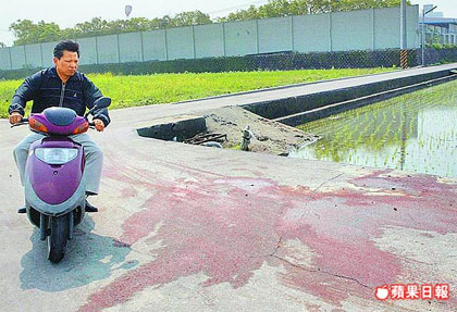 劉彥聰在路上被砍死,地上留下大灘血跡,行人途經(jīng)紛紛走避。 來源:臺灣《蘋果日報》