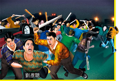 劉育榤隨即通知“阿淇”動員10多輛車、約30人赴約。林佑渝則找來自認(rèn)講義氣的死者劉彥聰?shù)人娜,分乘兩輛車抵達(dá),但見對方人手眾多想逃跑。林佑渝和傅姓少年所乘的車子因被路口玉米攤擋住難以脫身,傅姓少年當(dāng)場被打倒倒地,林則被砍傷逃入路旁稻田躲藏,事后住戶聽到求救聲,才將林佑渝、傅姓少年送醫(yī)。
