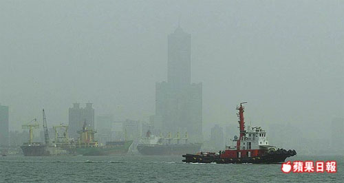 沙塵暴襲臺(tái),從高雄港海面上望去,原本可清楚看到輪廓的高雄市標(biāo)志性建筑85大樓宛如海市蜃樓。 來(lái)源:臺(tái)灣《蘋果日?qǐng)?bào)》