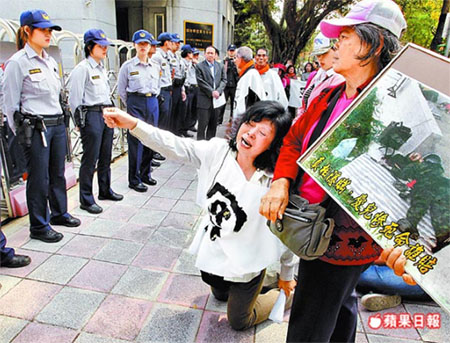蔡學(xué)良母親尤瑞敏昨日到臺(tái)空軍司令部前抗議,跪地痛哭要求臺(tái)空軍司令給真相。 來源:臺(tái)灣《蘋果日?qǐng)?bào)》