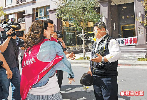 動物保護人士情緒激動的逼問林彥如(右)為何虐狗、并朝林丟雞蛋,一顆雞蛋就正中林的臉部。 來源:臺灣《蘋果日報》