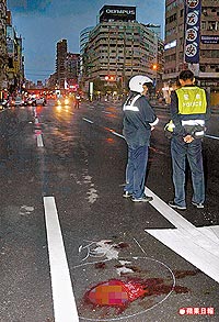 事故現(xiàn)場(chǎng)留下大灘血跡,但沒(méi)有監(jiān)視器錄下經(jīng)過(guò)與肇事逃逸車(chē)輛信息。圖片來(lái)源:臺(tái)灣《蘋(píng)果日?qǐng)?bào)》