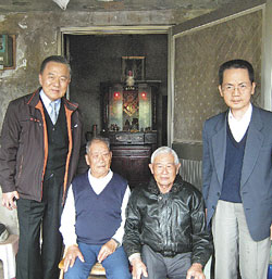 臺灣“監(jiān)委”余騰芳(左)和李炳南(右)在澎湖牛心灣訪談當(dāng)?shù)乩先耍?6歲的黃保安(左二)當(dāng)年是負(fù)責(zé)保護(hù)特攻隊(duì)的炮長,和薛必移(右二)同是日軍荒鷲中隊(duì)的成員。 來源:臺灣《中國時(shí)報(bào)》