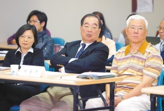 民進(jìn)黨“十年政綱”首場座談會(huì),大老尤清(右)到場踢館,質(zhì)疑黨主席蔡英文(左)從未立過選舉戰(zhàn)功。圖為兩人隔著民進(jìn)黨人士羅福全(中)聽取報(bào)告,互動(dòng)尷尬。圖片來源:臺(tái)灣《聯(lián)合報(bào)》