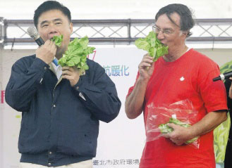 臺(tái)北市長(zhǎng)郝龍斌(左)昨天參加蔬食抗暖化活動(dòng),現(xiàn)場(chǎng)生吃劉力學(xué)(右)所種的有機(jī)蔬菜。圖片來(lái)源:臺(tái)灣《聯(lián)合報(bào)》
