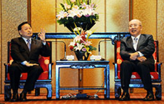 吳伯雄會見湖北省委書記羅清泉,表達(dá)了對青海震災(zāi)的關(guān)心。圖片來源:臺灣“中央社”