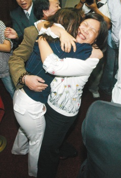 國民黨民代趙麗云(左)要宣布會議開始,卻被民進(jìn)黨籍民代管碧玲(右)用力抱住,兩人抱成一團(tuán),表情痛苦。 來源:臺灣《聯(lián)合晚報(bào)》