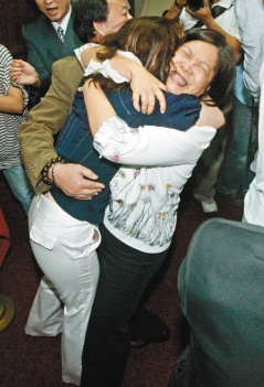 臺(tái)“立法院教育及文化委員會(huì)”上午排定審查陸生來(lái)臺(tái)相關(guān)“法案”,擔(dān)任會(huì)議主席的國(guó)民黨籍民意代表趙麗云(左)要宣布會(huì)議開(kāi)始,卻被民進(jìn)黨籍民代管碧玲(右)用力抱住,兩人抱成一團(tuán),表情痛苦。圖片來(lái)源:臺(tái)灣《聯(lián)合報(bào)》