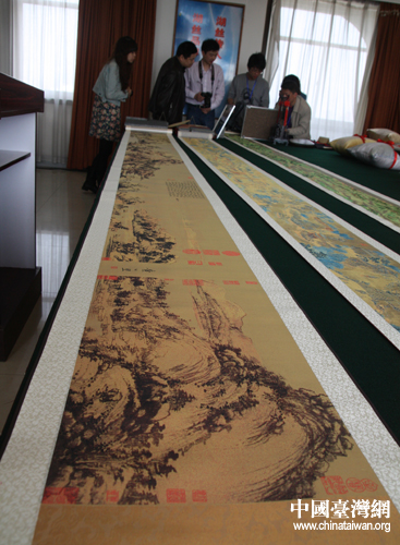 中國臺灣網(wǎng)4月26日湖州消息 一幅名卷展世博,兩岸深情盼團圓。25日,由人民網(wǎng)、中國臺灣網(wǎng)等23家網(wǎng)絡媒體組成的“全國知名網(wǎng)絡媒體浙江行”記者一行,走進了為世博會研制永久陳列絲綢國寶的絲綢之路集團,在60多件獻禮世博會的絲綢精品中,兩卷合一的絲綢織錦畫長卷《富春山居圖》引人注目。