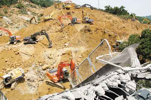 高速公路三號(hào)七堵段發(fā)生走山,今天上午挖土機(jī)等重型機(jī)車持續(xù)開挖,仍未發(fā)現(xiàn)受困人車,圖前方為斷裂的大埔跨越橋面,鋼筋扭曲變形。圖片來源:臺(tái)灣《聯(lián)合晚報(bào)》