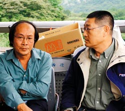 兩位焦急的父親,李錫昌(左)、郭恒龍(右)的子女可能被山崩掩埋,兩人在現(xiàn)場只能等待和互相打氣。圖片來源:臺灣《聯(lián)合報(bào)》