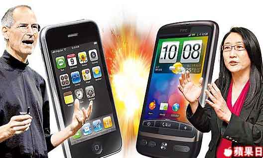 宏達(dá)電控蘋果侵犯五項(xiàng)專利。右為宏達(dá)電董事長王雪紅,左為蘋果執(zhí)行長賈伯斯。圖片來源:臺(tái)灣《蘋果日報(bào)》