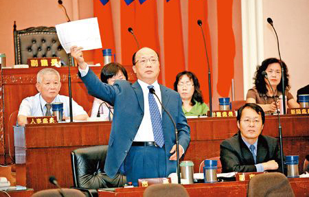 臺中市日前發(fā)生槍擊案竟有員警在場,市長胡志強“消息不靈”,昨日在議會現(xiàn)場高舉報告說“我今天才拿到!眻D片來源:臺灣《中國時報》