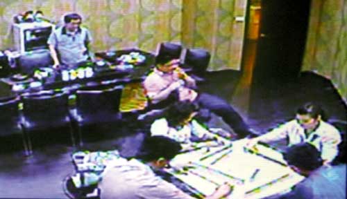 臺(tái)中角頭翁奇楠命案槍擊現(xiàn)場(chǎng)泡茶室曝光,臺(tái)中市警方昨晚公布錄像畫面,圖為事發(fā)五日前,臺(tái)中市警偵查佐戴志宏(右下角、著藍(lán)衣)正與另三人打麻將。