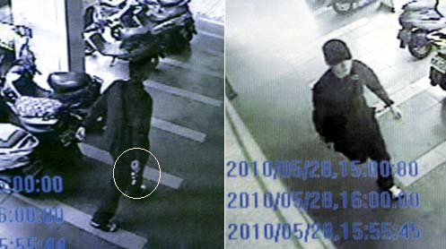 臺(tái)中市警方昨晚公布翁奇楠遭槍擊案相關(guān)錄像畫面,圖為兇手持槍(左圖圈處)走過(guò)槍擊現(xiàn)場(chǎng)附近民宅騎樓的畫面。 圖片來(lái)源:臺(tái)灣《聯(lián)合報(bào)》