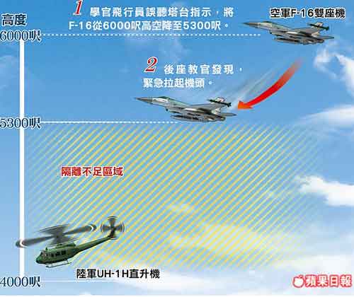 該戰(zhàn)機(jī)在下降至5300呎時(shí),同機(jī)隨行的后座教官覺(jué)得不對(duì)勁,要求前座的飛行員再向航管確認(rèn)高度;當(dāng)時(shí)的航管人員也發(fā)現(xiàn)F-16戰(zhàn)機(jī)未依規(guī)定在6000呎高度,也要求戰(zhàn)機(jī)立即改正至6000呎。教官警覺(jué)有問(wèn)題,立即接手飛行操作,緊急將戰(zhàn)機(jī)拉高高度,仍差一點(diǎn)與在航道下方,高度約4000多呎的臺(tái)陸軍UH-1H直升機(jī)發(fā)生“空中接近”事件。