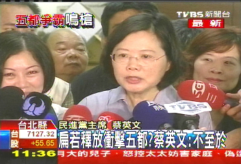 被問及如果明天(陳水扁)被釋放,是否會會沖擊選情。民進黨主席蔡英文說,“我覺得不至于啦,因為,經(jīng)過這兩年來的沉淀,還有很多我們的思考,陳水扁的這個案子,現(xiàn)在大家思考都比較成熟,面對這個問題也都比較沉穩(wěn),我不認為這個問題在我們五都選戰(zhàn)里面,會有什么很大的沖擊!