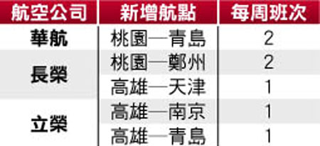 臺(tái)當(dāng)局“民航局”昨公布島內(nèi)航空公司新增航班分配結(jié)果,華航和長(zhǎng)榮集團(tuán)各取得15班,復(fù)興航空分得6班。新航線包括:華航的桃園飛青島、長(zhǎng)榮的桃園飛鄭州和高雄飛天津,立榮的高雄飛南京和青島,新增航線每周共飛7班。