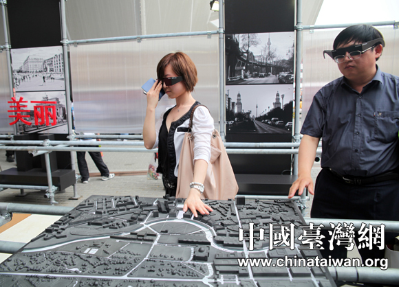 6月11日,兩名游客在上海世博園德國館外圍參加體驗(yàn)項(xiàng)目——觀眾帶上眼罩,“閉上眼睛看”城市,游客借助可觸摸的城市模型,通過觸覺、聽覺去欣賞這些建筑和其所在的地區(qū)。(中國臺(tái)灣網(wǎng) 田云鵬 攝)